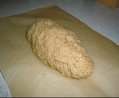 " Modus „Teig kneten“" kneten. Den Teig zu einem Laib formen, auf ein mit Backpapier belegtes Blech legen und ca. 45 min. gehen lassen. Brot im vorgeheizten Backofen bei Umluft 175° Grad ca. 45 min. backen.