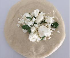 Die Teiglinge ausrollen und jeweils 1-2 TL Füllung in die Mitte der Teiglinge verteilen. - Die Enden der Teiglinge zusammendrücken, damit nichts rausfällt. Die zusammengedrückte Seite nach unten legen.