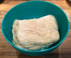 Dann einmal von rechts in die Mitte falten und die linke Seite drüberschlagen. Noch ein wenig platt drücken und noch einmal zusammen legen. In eine bemehlte Schüssel geben und nochmal 20 - 30 Minuten an einem warmen Ort gehen lassen.