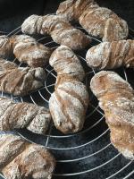 Vorm Backen die Stoneware (oder ein Backblech) und die Teigunterlage mit Dinkelgriess und Roggenmehl bestreuen. Den Teig auf die bestreute Teigunterlage geben und mit dem Nylonmesser in gleich große Stücke teilen. Jedes Teigstück im Dinkelgriess oder Mohn (oder worauf man grad Lust hat) wälzen und dabei in sich drehen und auf die Stoneware legen und ggf. mit Mohn, Grieß, Saaten oder Körnern oder Mehl bestreuen.