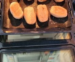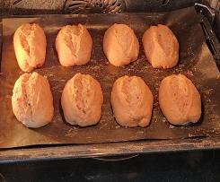Dann Ofen auf 220°C herunterdrehen und 18 Minuten backen. - Dann Backblech kurz raus holen (Ofentür schnell wieder schließen) und alle Brötchen einmal umdrehen (Bodenseite des Brötchen nach oben) und nochmal 5 Min. knusprig backen.