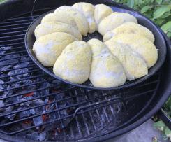 Teiglinge auf eine Grillform legen und weitere 30 min abgedeckt gehen lassen. - Bei milder Glut indirekt ca. 10-15 min mit geschlossenem Deckel grillen.
