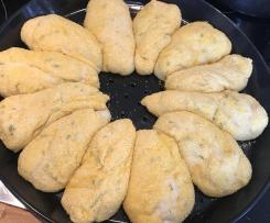Teig in eine geölte Schüssel füllen und etwa 1 Stunde zugedeckt an einem warmen Ort gehen lassen. - Mit einem großen geölten Löffel (ich benutze einen Gemüselöffel) Portionen abstechen und jeweils in Maisgries wenden, den weichen Teig dabei vorsichtig länglich formen.