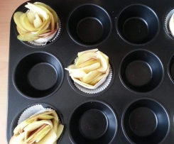 Mit einem Hobel die Äpfel in dünne scheiben hobeln und diese dann auf die Streifen legen einrollen , unten Verschließen und in die Form rein...