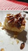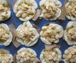 Die Mandelblättchen mit dem aufgefangenen Apfel-Butter-Sirup vermischen. Nach den 12 Minuten das Muffin-Blech herausnehmen. Die Mandeln auf den Natas verteilen ....