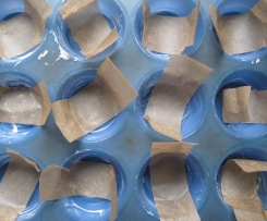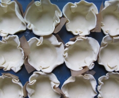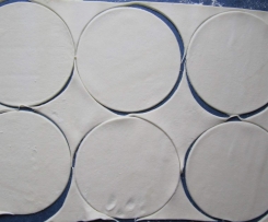Teigkreise in die Mulden legen und am Rand leicht andrücken. (Einfacher geht es, wenn man die Papierstreifen mittig auf die Teigkreise legt und diese Kreise dann zusammen mit dem Papier in die Mulden "drückt".)