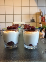 Den Rühraufsatz wieder entfernen und die Creme auf die Sauerkirschen verteilen. Das Ganze mit dunklem Kakaopulver bestreuen und dann ca. 1 Stunde kaltstellen.