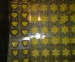 Und die Hohlkugeln sind eben hohl und man befüllt sie dann und nach der Wartezeit muss man dann die Löcher mit Schokolade zumachen.