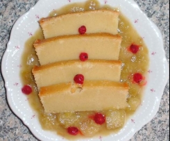 Rhabarber-Kompott ist warm.Den Pudding wie oben angegeben zubereiten, in einer größeren Form backen , abkühlen lassen und in Scheiben schneiden.
