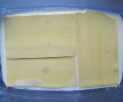 Mit Lasagneplatten abschließen und den restlichen Guss darüber gießen. Die Lasagne besteht so aus vier Schichten Nudeln und drei Schichten Füllung. Die Lasagneplatten mit der Hand etwas herunter drücken.