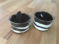 - Mit den Kekskrümel beginnend, die Krümel und die Creme abwechselnd in eine Schüssel schichten. Erste und letzte Schicht sollten die Krümel sein.