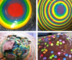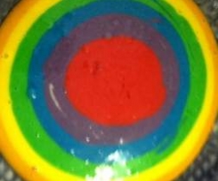 Nun abwechselnd (rot, orange, gelb, grün, blau, lila) in die MITTE der gefetteten und bemehlten Springform 2 Esslöffel Teig geben.