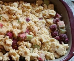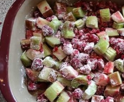2. Rhabarber putzen, waschen und je nach Dicke längst halbieren. In 2 cm lange Stücke schneiden. Mit den Himbeeren, dem Zucker und der Stärke mischen und in die Auflaufform geben.