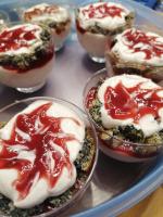 Jetzt den fertigen Kuchen und die Quark-/Sahnemasse zügig in die 6 Gläser schichten. Kuchen-Quark-/Sahnemasse-Kuchen-Quark-/Sahnemasse. Bis zum Glasrand sollten noch etwa 2-3 cm Platz sein (abhängig vom gewählten Obst). Die gefüllten Gläser nun eine Stunde im Külschrank komplett erkalten und fest werden lassen.