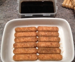 Die Hälfte der Löffelbiskuits beidseitig kurz in die Espressomischung tauchen und den Boden einer Form damit auslegen.
