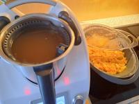 Topf ausspülen. 1 l Wasser einfüllen, Gareinsatz einhängen u Varoma aufsetzen und 60 Min. Stufe Varoma einschalten. Das Wasser im TM verdampft und der Saft befindet sich dann im Topf.
