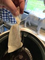 Kleiner Tipp: Ich habe die Gewürze in Teebeutel getan. Das erleichtert das Herausfischen und wie ich finde, trübt es den Likör nicht ein, wenn man gemahlenen Kardamon oder Piment verwendet.