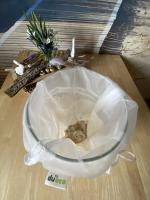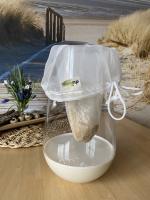 Hilfreich ist es, sich einen Nußmilchbeutel zuzulegen, zum anschliessenden durchseihen. Alternativ hierzu geht aber auch gut ein Nylonstrumpf (ungetragen