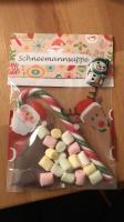 Eine Portion Trinkschokolade in ein seperates Tütchen packen ( ich habe es eingeschweisst) Zusammen mit dem Mini Marshmallows und der Zuckerstange in einen Zellophanbeutel geben. Anleitung ausdrucken und mit in die Tüte geben. Mit einem schönen Tonkarton verschliessen und fertig ist die Schneemannsuppe.