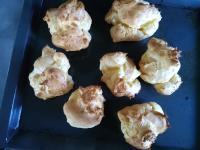 Habe den Brandteig mit Rosinen als Krapfen in Kokosfett abgebacken .Die 3 Eier habe ich nach und nach in den noch heißen