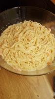 Spaghetti abgießen (eine Kelle Nudelwasser aufheben). Im noch heißen Topf die Nudeln mit der Soße vermischen und etwas Nudelwasser dazurühren.