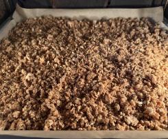 "Linkslauf" / Stufe 3 - Auf das Backblech verteilen und in der Ofenmitte ca. 40 Minuten lang backen. Eventuell auf zwei Portionen aufteilen. Dabei alle 10 – 15 Minuten umrühren, damit das Knuspermüsli gleichmäßig trocknet. Sobald es goldbraun und knusprig ist, aus dem Ofen nehmen und abkühlen lassen.
