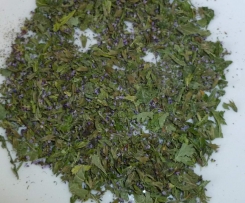 "Mixtopf geschlossen" reingeben (locker eingefüllt fast ganz voll machen). Auf Stufe 10 ca. 3 max. 4 Sekunden zerkleinern. Ich halte alle Kräuter getrennt, dann kann ich mir individuelle Mischungen zusammenstellen, eine tolle Mischung ist z.B. Oregano, Majoran, Thymian, Ysop, wenig Salbei und wer mag noch Minze dazu.