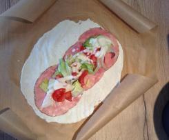 - Nun den "Käsefladen"füllen und aufrollen. Einmal durchschneiden und fertig.