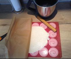 7 Minuten Varoma Stufe 1. Nach etwa der Hälfte der Zeit die Kugel einmal drehen. - Die Kugel auf ein Backpapier legen und ein weiteres Backpapier drauflegen. Nun die Kugel flach ausrollen (ca 22 cm Durchmesser).