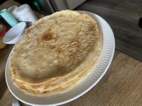 Den ersten habe ich mit Apfelspalten belegt. Die nächsten beiden habe ich als Crepe gebacken, dann war immer noch Teig übrig für einen Pfannkuchen übrig, den habe ich ohne Belag gebacken, werde ich in Streifen schneiden und für eine Suppe verwenden.
