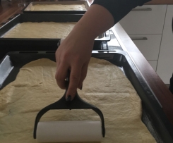 - Auf den Teig die kalte Butter-Eimasse (1 EL Mehl in diese Masse noch sieben) streichen und je 3 Bleche bei 210 Grad backen ca. 15 Minuten. Wenn der Teig beim backen Blasen schlägt mit der Gabel kurz einstechen und fertig backen bis goldbraun.