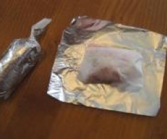 Aus Alufolie ca. 20x20 cm große Quadrate herrichten ( ca. 6 Stück) und jeweils mit 2 Scheiben Räucherlachs belegen.