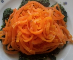 2. Karotten schälen und mit dem Spaghettihobel in den Varoma hobeln, oder wahlweise auch dünne Streifen/Scheiben hobeln/schneiden.