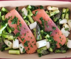 Hat uns gut geschmeckt. 'Da es zur Zeit ja schlecht ausschaut mit Spargel, kam bei uns auch Broccoli in die Auflaufform. Den empfehl ich aber vorzukochen, da er ansonsten zu bissfest ist. Die Garzeit für den gefrorenen Lachs ist perfekt. Ich hab die doppelte Menge für vier Personen zubereitet. Ist problemlos machbar