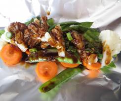 Die Alufolie an allen Seiten einschlagen und oben verschließen, sodass keine Feuchtigkeit entweichen kann. Das Paket in den vorgeheizten Backofen schieben und bei 180°C für ca. 25 bis 40 Minuten garen.