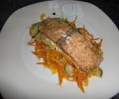 Varoma mit Gemüse füllen, auf den oberen Varomaboden Backpapier legen und darauf das Lachsfilet(evtl. auf das Lachsfilet eine Scheibe Zitrone). Das ganze 25 Min., Varoma, Stufe 1.