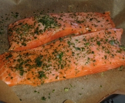 Varomaeinsatz mit Backpapier auslegen, Lachs hineingeben und mit verschiedenen Kräutern bestreuen.