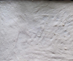 Ein Backblech einfetten (meins hat eine Fläche von 29 x 39 cm) und den Teig darauf geben. Den Teig bemehlen und auf dem Blech ausrollen. Zugedeckt weitere ca. 10 Minuten gehen. lassen.