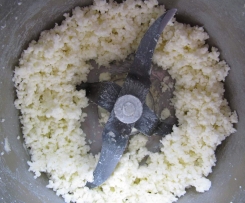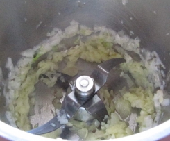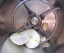 .... und 5 Sek. / St. 5 zerkleinern. Mit dem Spatel nach unten schieben und das Olivenöl hinzufügen. Das Ganze 2 Min. / Varoma / St. 1 dünsten.