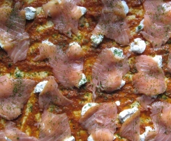Das Rezept stammt aus der Zeitschrift Chefkoch. Man kann nach dem Backen auch noch Krabben auf die Pizza geben.