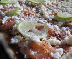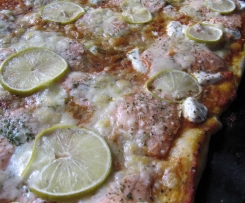 Die Pizza im heißen Ofen auf der 2. Schiene von unten ca. 10 Minuten backen. Vor dem Servieren die Limettenscheiben entfernen.