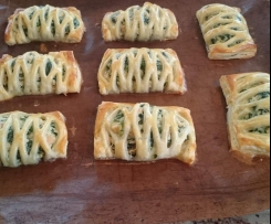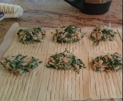 Wie auch bei meinen Vorrednern war die Füllung sehr reichlich bemessen, sodas 15 Taschen der angegebenen Größe daraus wurden. Also, entweder 2 Päckchen gerollten Blätterteig kaufen oder die Füllung halbieren.