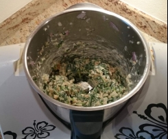 Einen Schuß Öl zugeben und 3 Min./Varoma/Stufe 1 - Spinat, Räucherlachs und Frischkäse in den Mixtopf mit Salz, Pfeffer und Muskat würzen. 5 Sek./Stufe 4/