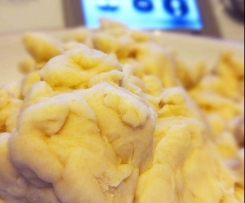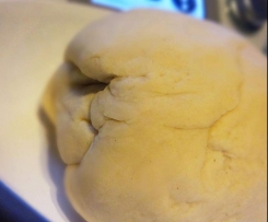 Der Teig muss ziemlich fest sein. Wenn er krümelig ist, auf der Arbeitsfläche mit den Händen zu einer Kugel formen und in einer Schüssel mit einem feuchten Tuch (Küchenkrepp reicht aus) abgedeckt 10min. ruhen lassen.