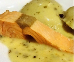 Varoma-Einlegeboden mit feuchtem Backpapier auslegen, Fischfilets salzen, pfeffern und mit Zitronensaft beträufeln, hineinlegen, dann mit dem Deckel verschließen und 12min./Varoma/Stufe 2 garen.