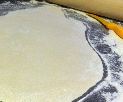 Pastateig auf der leicht bemehlten Arbeitsplatte 3-4mm dünn ausrollen und in 2 gleichgroße Teile teilen.