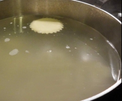 Salzwasser in einem großen Kochtopf zum Kochen bringen, Ravioli mit einer Schaumkelle hingleiten lassen, kurz aufkochen lassen, Temperatur auf mittlere Hitze herunterdrehen, nicht mehr kochen!.