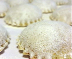 Ravioli nun mit dem Ausstecher ausstechen, auf ein Brett legen, mit etwas Mehl betäuben und ca. 15-25min. trocknen lassen.