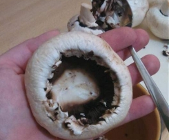 - Die Champignons säubern und die Stiele abschneiden oder vorsichtig herausbrechen. Mit einem kleinen Teelöffel mit kreisenden Bewegungen ein wenig innen aushöhlen, nicht viel, da sie dann schnell brechen. Nur ein wenig, Platz für die Füllung schaffen. Alles was dabei abgekratzt wird, in einer kleinen Schale auffangen, wird nicht weg geworfen! Ich werfe nur den Stiel weg. Das Hackfleisch in eine Schale geben und nach belieben würzen. Jeden Pilz mit einer kleinen Portionen Hackfleisch füllen. Das übrige Hackfleisch brauchen wir für die Soße. Die gefüllten Pilze auf den Einlegeboden des Varoma legen, die Scheiben Käse zuschneiden und auf die Pilze legen. Ich bevorzuge Scheiben, da die Raspeln nie liegen bleiben, wo sie sollen.