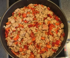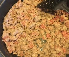 ca. 15 min vor Ende der Saucenkochzeit das Mett in einem Topf krümelig braten.